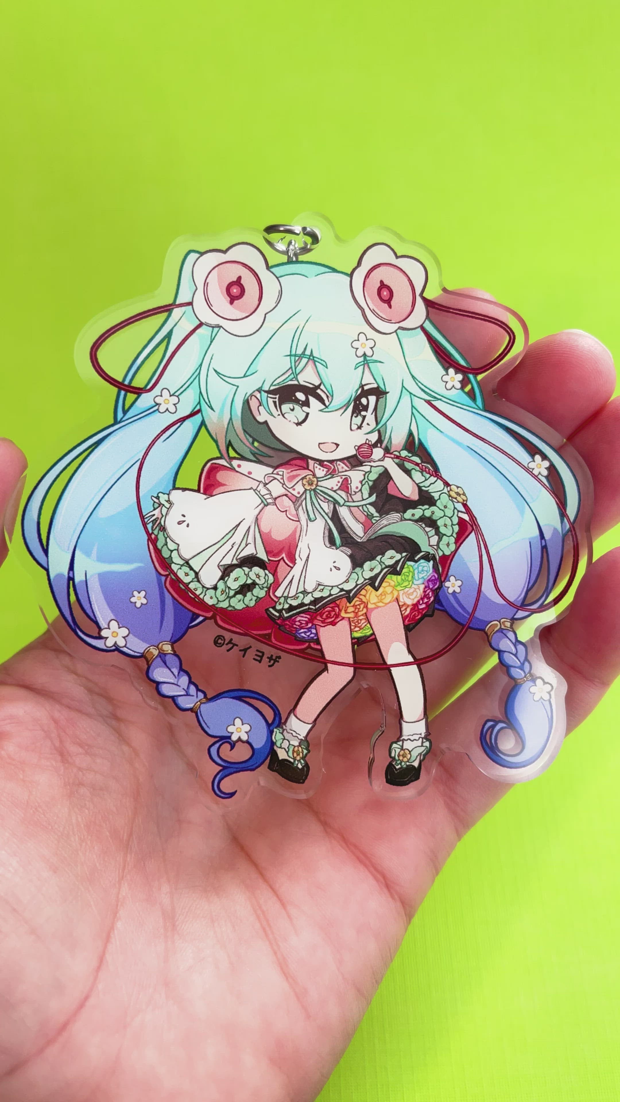 Printed professionally on 3mm acrylic, each charm is 3.5 inches in height not including the metal keyring chain.